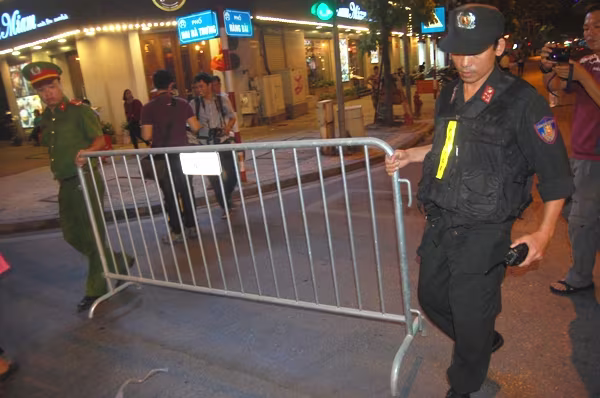 Sau cái nóng oi nồng ban ngày, tiết trời Hà Nội tối nay như khéo chiều lòng người khi bỗng dịu mát lạ. 18h, các chốt lực lượng CSGT, CAP, CSCĐ, CSTT đã có mặt. Hệ thống barie và dây phản quang dùng cho công tác phân luồng, đảm bảo ATGT đã được tập kết tại các vị trí định sẵn trên vỉa hè.