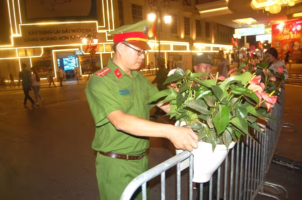 Ở ngã tư Tràng Tiền- Hàng Khay, một tổ công tác của CAP Hàng Bài ứng trực từ rất sớm. Đúng 19h, cùng với các chốt phía ngoài cùng, lực lượng CAP sử dụng các thiết bị dùng để phân luồng, hướng dẫn nhân dân đi lại. Từng chậu hoa nhỏ xinh được thiết kế tinh tế, khéo léo trang trí trên những chiếc barie tại thành một bức tường hoa tự nhiên. Những cô cậu thanh thiếu niên cười nói rộn ràng, háo hức cứ đứng cạnh những chậu hoa này để chụp ảnh.