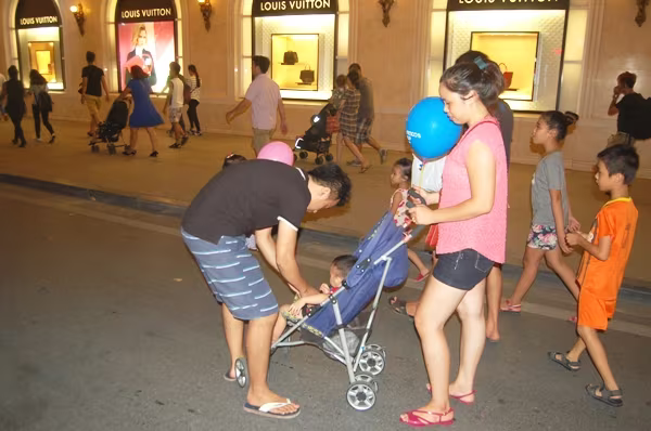 Em bé vẫn còn ngồi trên xe đẩy được bố mẹ đưa đi dạo phố trong không gian đi bộ xung quanh hồ Hoàn Kiếm trong niềm vui của cả gia đình