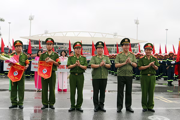 Đại tướng Trần Đại Quang, Bộ trưởng Bộ Công an cùng các đồng chí lãnh đạo tặng hoa, cờ lưu niệm các đội dự chung kết Hội thi thể thao nghiệp vụ chữa cháy và cứu nạn, cứu hộ