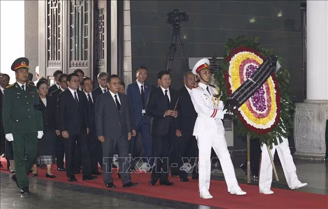 Đoàn Chính phủ Lào do Thủ tướng Lào Thongloun Sisoulith dẫn đầu viếng nguyên Tổng Bí thư Đỗ Mười. Ảnh: TTXVN