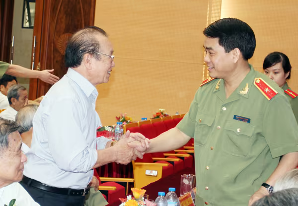 Thiếu tướng Nguyễn Đức Chung - Bí thư Đảng ủy, Giám đốc CATP Hà Nội ân cần hỏi thăm các đồng chí lão thành cách mạng, cán bộ công an hưu trí