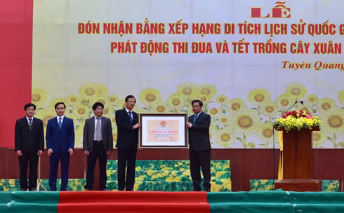 Đồng chí Phạm Minh Chính, Ủy viên Bộ Chính trị, Bí thư Trung ương Đảng trao Bằng xếp hạng Di tích lịch sử Quốc gia đặc biệt Kim Bình cho tỉnh Tuyên Quang.