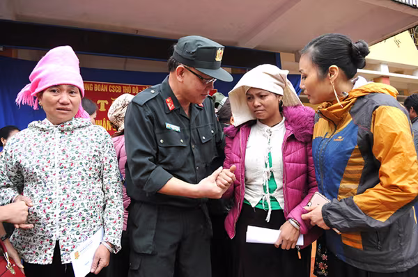 Thượng tá Phạm Phi Hùng động viên người dân bị lũ quét và sạt lở đất tại Yên Bái năm 2017