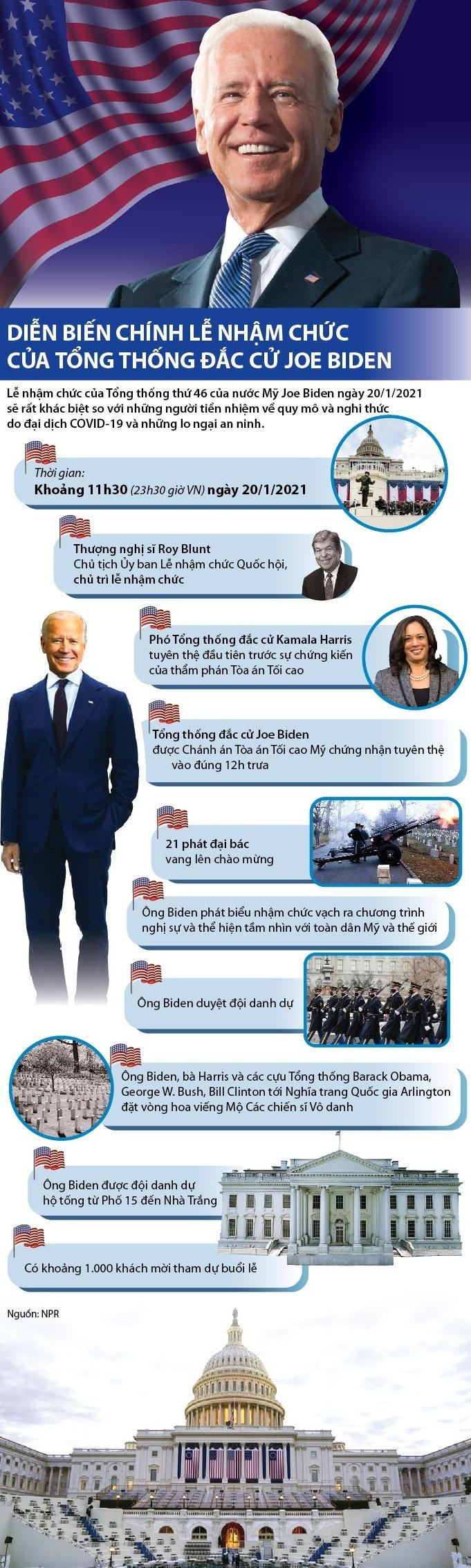 Lễ nhậm chức Tổng thống Mỹ lần thứ 46 diễn ra vào 11h30 ngày 20-1 (tức 23h30 khuya 20-1 theo giờ Việt Nam) ở bên ngoài tòa nhà Quốc hội Mỹ. Kể từ khi xảy ra vụ bạo loạn tại tòa nhà Quốc hội hôm 6-1-2021, giới chức an ninh Mỹ đã lên kế hoạch ngăn chặn mọi rủi ro an ninh. Phần lớn hoạt động giao thông bị cấm ở khu vực trung tâm Thủ đô Washington D.C. Nhà Trắng, tòa nhà Quốc hội cùng những tòa nhà Chính phủ khác đều được dựng rào chắn trong lúc hơn 25.000 thành viên Vệ binh Quốc gia được triển khai bảo vệ an ninh.