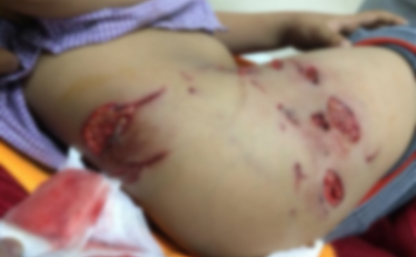 Bệnh nhi Nguyễn Hải Đ. vừa được đưa vào cấp cứu tại Trung Tâm Sản Nhi – Bệnh viện Đa khoa tỉnh Phú Thọ trong tình trạng hoảng sợ, nhiều vết cắn ở vùng bắp đùi cả hai chân, lộ cả gân cơ cẳng chân trái.