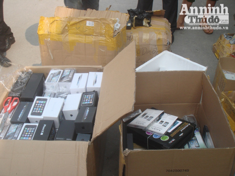 Khi cánh cửa đuôi xe ô tô bật mở, bên trong là những thùng cacton được xếp chồng lên nhau. Trong thùng cacton này đựng hàng nghìn linh kiện, phụ kiện của các dòng điện thoại cao cấp như iPhone 3, 4, 5 và máy tính bảng, iPad.