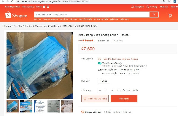 Tại Shopee.vn, gian hàng của Kiều Oanh Authentic (Hà Nội) đăng bán khẩu trang y tế 4 lớp kháng khuẩn có giá 7.500 đồng/chiếc, nhãn hiệu Quốc Bảo, tương đương 375.000 đồng/hộp 50 chiếc. Shop này cũng bán giá 72.000 đồng/10 chiếc khẩu trang cùng loại, tương đương 7.200 đồng/chiếc.