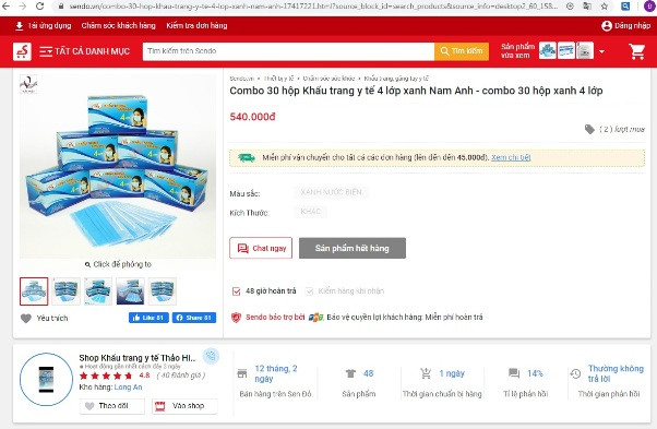 Trong khi đó, giá bán sản phẩm có mẫu mã cùng loại tại Lazada.vn giá chỉ từ 20.000 đồng/hộp 50 chiếc, nhưng khách mua hàng đánh giá sản phẩm nhận được quá mỏng, hộp bị rách móp, bị xẹp. Tại Sendo.vn, shop khẩu trang y tế Thảo Hiền (Long An) bán combo 30 hộp giá 540.000 đồng, tức 18.000 đồng/hộp!