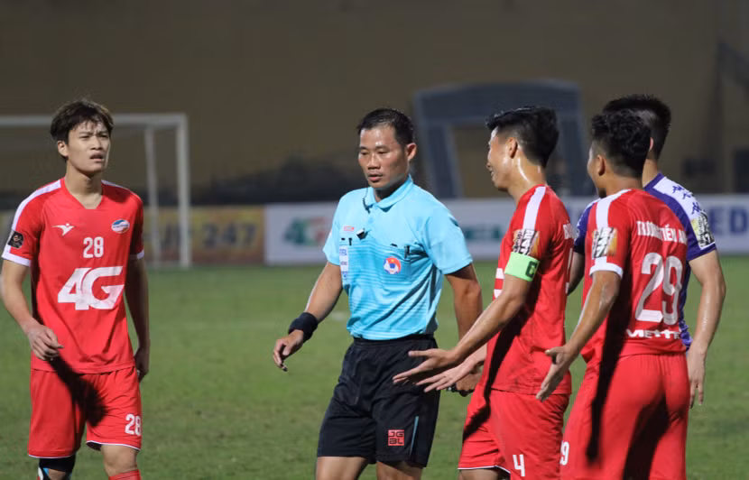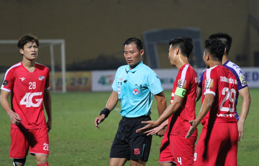 Suốt trận, trọng tài Trần Đình Thịnh có nhiều quyết định bị cầu thủ hai đội phản ứng