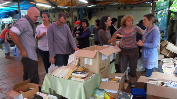 Cùng với rau quả, những đồ dùng nội trợ, sách cũng được bày bán ở đây, nhiều nhất vẫn là ấn phẩm bằng tiếng Pháp và tiếng Việt. Sách bán theo từng chủ đề, chẳng hạn như tuần này về sách về thiếu nhi, tuần sau về sách văn hóa.
