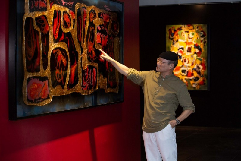 Họa sỹ Ngô Xuân Bính trước một bức tranh của ông