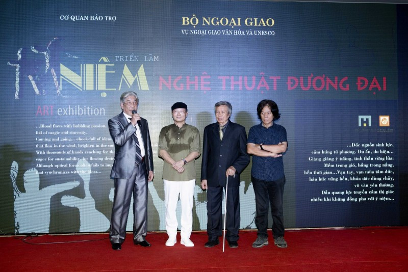 Họa sĩ Ngô Xuân Bính, Lê Văn Thìn, Đặng Tin Tưởng và nghệ nhân Đào Trọng Cường tại buổi khai mạc triển lãm "Niệm"