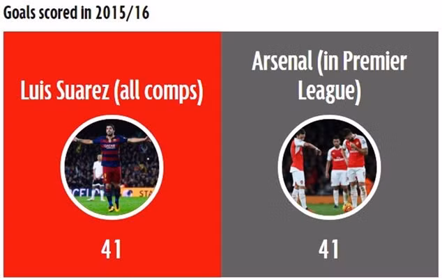 Đảm nhận vai trò trung phong, Suarez hiện là cây săn bàn hàng đầu của Barcelona. Cựu cầu thủ của Liverpool đã có 41 bàn thắng ở mùa này, chỉ trong 37 trận, ngang ngửa với số bàn thắng mà “Pháo thủ” ghi được.