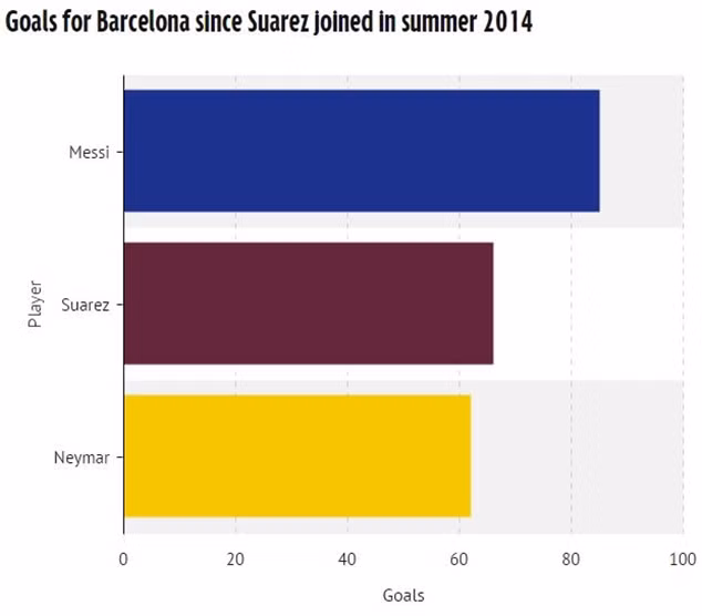 Kể từ lúc Suarez cập bến Nou Camp, Barcelona sở hữu “cây đinh ba” được ví von là vĩ đại nhất trong lịch sử bóng đá thế giới. Chỉ tính riêng trong mùa giải năm nay, họ đã ghi được 91 bàn thắng.