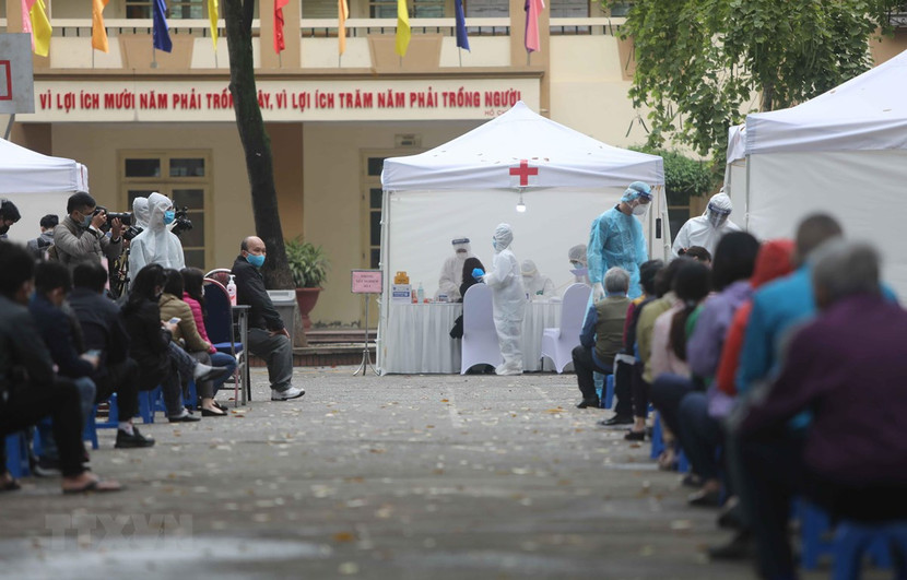Người dân tới xét nghiệm tại điểm test nhanh ở trường THCS Đống Đa (Hà Nội). (Ảnh: Thanh Tùng/TTXVN)