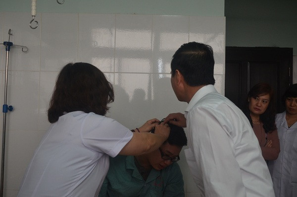 Một trong hai bác sĩ ở Bệnh viện Sản Nhi Yên Bái bị hành hung gây chảy máu đầu, được đồng nghiệp chăm sóc vết thương