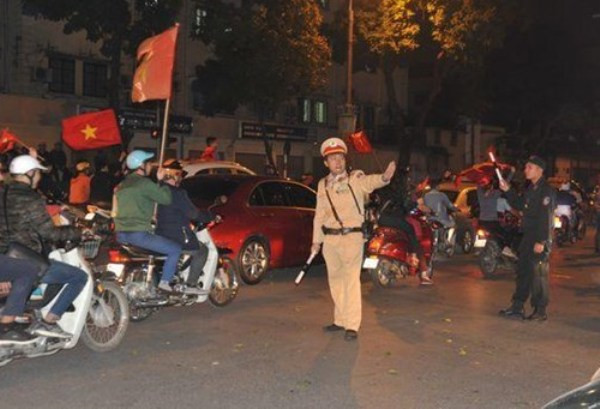 Công an Hà Nội phân luồng, đảm bảo trật tự an toàn giao thông trên đường phố Thủ đô sau khi đội tuyển bóng đá Việt Nam thi đấu dành chiến thắng trên đấu trường quốc tế