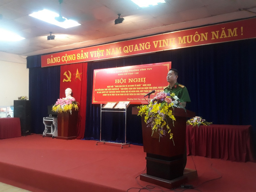 Chuyên đề “Vận động toàn dân tham gia nắm tình hình, phát hiện và giải quyết kịp thời mâu thuẫn trong nội bộ nhân dân; góp phần giữ vững an ninh chính trị và trật tự an toàn xã hội trên địa bàn” được BCĐ 138 phường Vĩnh Tuy tại hội nghị “Ngày hội toàn dân bảo vệ an ninh Tổ quốc”, diễn ra chiều 30-7; với sự tham dự của ban chỉ huy và đại diện các đội nghiệp vụ Công an quận Hai Bà Trưng; các ngành, đoàn thể phường, đại diện chi bộ khu dân cư, tổ dân phố…