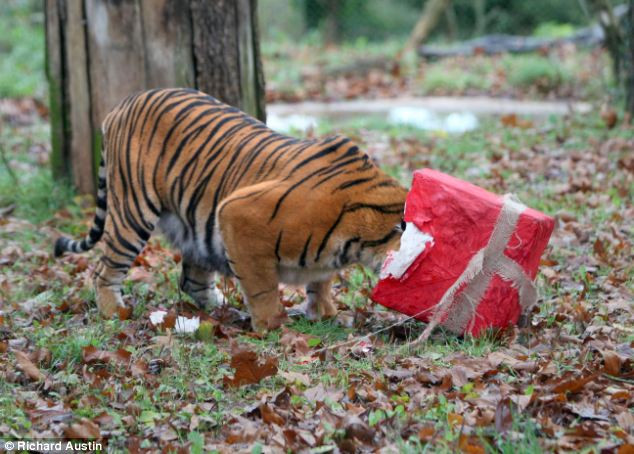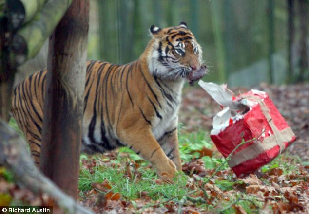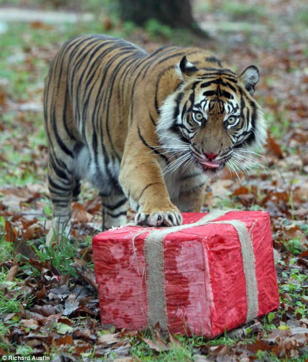 Món quà chứa trong hộp đơn giản là một miếng thịt thơm ngon, dành cho các chú hổ ở vườn thú hay háu đói. Nhưng một chú hổ cái đã không thể thoát đầu ra khỏi hộp quà. Các nhân viên tại vườn thú Paignton ở Devon, nước Anh đã tặng cho Banda, một chú hổ cái sống với bạn cùng chuồng là Tenang, vốn thuộc loại hổ Sumatran quý hiếm hộp quà Giáng Sinh. Chú hổ Banda sau khi bị mặc kẹt trong chiếc hộp đã có thể tự giải phóng mình.