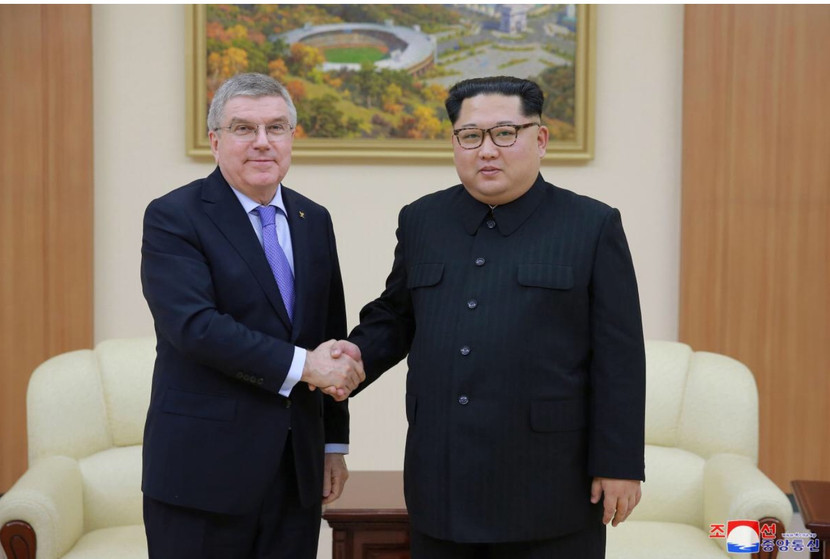 Chỉ tịch Ủy ban Olympic Quốc tế (IOC) Thomas Bach và nhà lãnh đạo Triều Tiên Kim Jong-un trong cuộc gặp