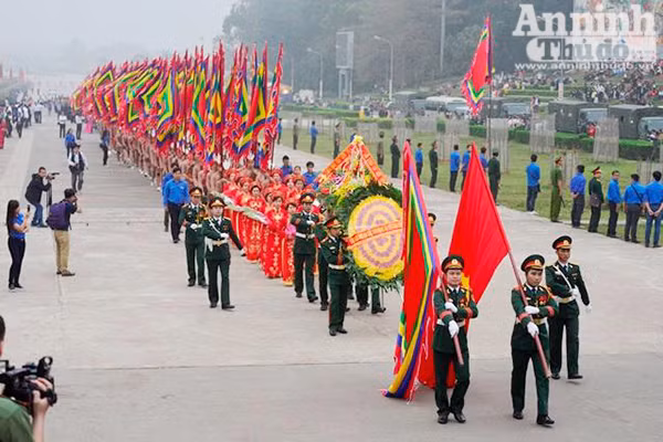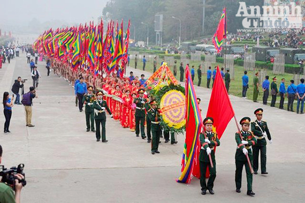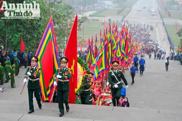 Đội tiêu binh rước cờ Tổ quốc, cờ hội, vòng hoa mang dòng chữ “Ðời đời nhớ ơn các vua Hùng đã có công dựng nước”.