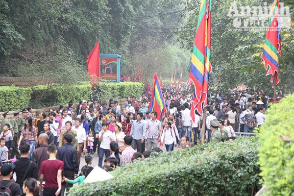 Đội tiêu binh nghiêm trang rước cờ, phía sau là nhân dân thập phương về dự Giỗ Tổ Hùng Vương.