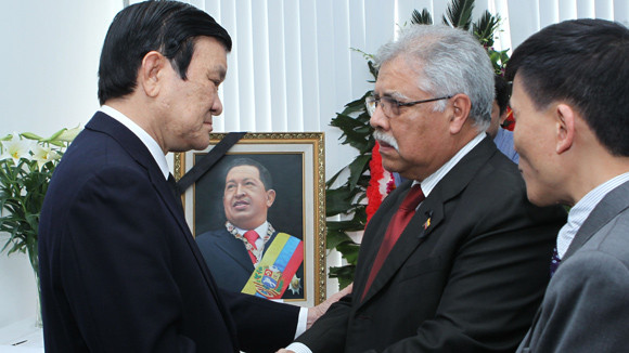 Chia buồn với cán bộ nhân viên Đại sứ quán, Chủ tịch nước Trương Tấn Sang bày tỏ, Đảng, Nhà nước và nhân dân Việt Nam vô cùng thương tiếc Tổng thống Venezuela Hugo Chavez, người anh em thân thiết của nhân dân Việt Nam, người bạn của nhân dân tiến bộ trên thế giới, một chiến sĩ của tư tưởng Cách mạng Boliva đã phấn đấu không mệt mỏi vì một Tổ quốc Venezuela xã hội chủ nghĩa, vì một thế giới công bằng, tốt đẹp và tràn đầy tình đoàn kết giữa các dân tộc. Nhân dân Việt Nam sẽ mãi mãi ghi nhớ những tình cảm sâu đậm mà người anh em, Tổng thống Chavez, đã dành cho đất nước và nhân dân Việt Nam, cùng những đóng góp to lớn và quý báu của Tổng thống đối với việc tăng cường và thắt chặt mối quan hệ hữu nghị, đoàn kết và hợp tác giữa Việt Nam và Venezuela.