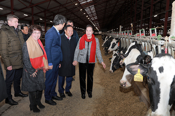 Ủy viên Bộ Chính trị, Chủ tịch Quốc hội nước CHXHCN Việt Nam - bà Nguyễn Thị Kim Ngân cùng Đại sứ đặc mệnh toàn quyền Việt Nam tại LB Nga, ông Ngô Đức Mạnh đi thăm và ấn tượng trước trang trại bò sữa của Tập đoàn TH tại Moscow.