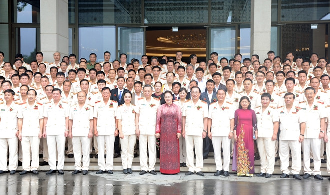 Chủ tịch Quốc hội Nguyễn Thị Kim Ngân và Bộ trưởng Tô Lâm chụp ảnh lưu niệm cùng đại diện các gương điển hình tiên tiến trong CAND
