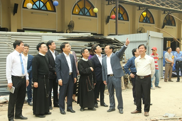 Chủ tịch UBND TP Nguyễn Đức Chung cùng linh mục Trịnh Ngọc Hiên thăm công trình nhà mục vụ của giáo xứ đang được xây dựng
