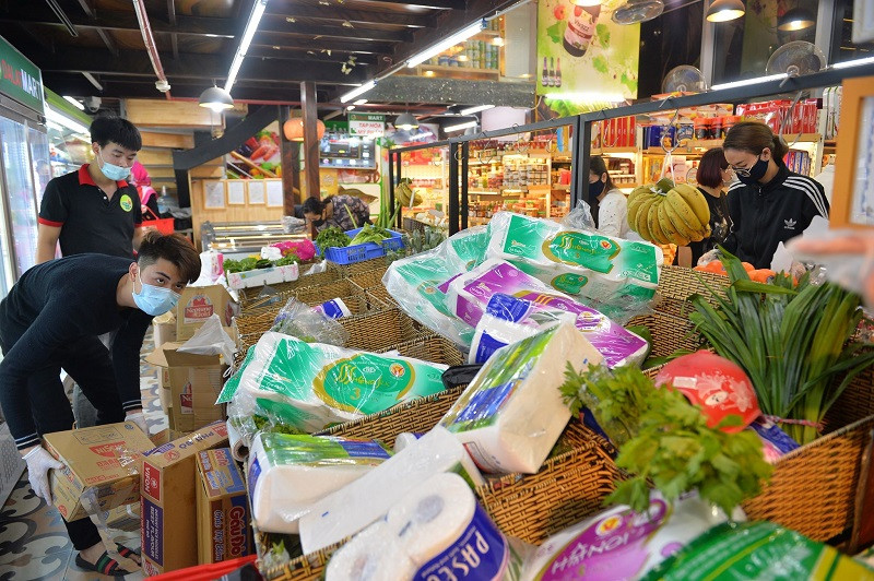 Ngay trong đêm, sau khi có hình ảnh trên mạng xã hội về lực lượng phòng dịch đến làm việc ở tòa nhà Times City (Minh Khai, Hai Bà Trưng), người dân ở khu vực này đã đổ xô ra siêu thị mua mỳ tôm, giấy ăn...