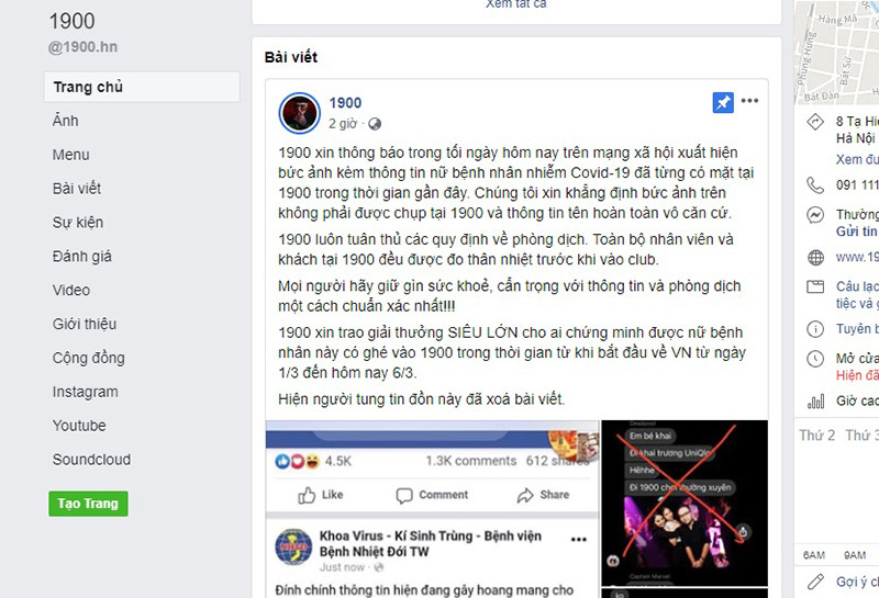 Toàn bộ nhân viên và khách tại 1900 đều được đo thân nhiệt trước khi vào club. 1900 xin trao giải thưởng cho ai chứng minh được nữ bệnh nhân này có ghé vào 1900 trong thời gian từ khi bắt đầu về VN từ ngày 1/3 đến hôm nay 6/3. Hiện người tung tin đồn này đã xóa bài viết”.