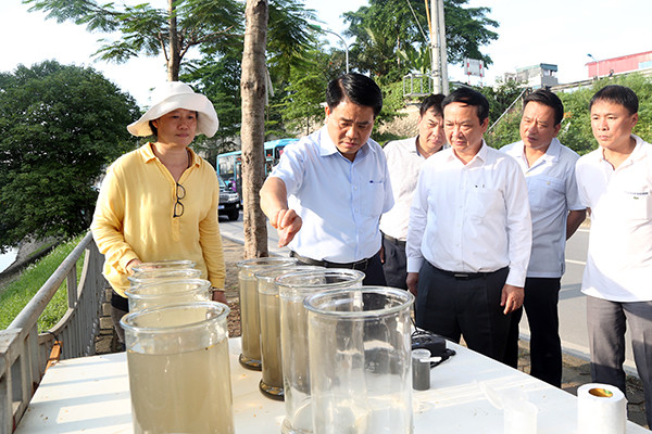 Chủ tịch UBND TP Nguyễn Đức Chung kiểm tra việc thử nghiệm làm sạch sông Tô Lịch bằng công nghệ châu Âu