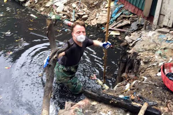 Hình ảnh anh James Kendall và những người bạn nhặc rác ở một con mương ở phường Yên Hoà, Cầu Giấy