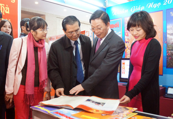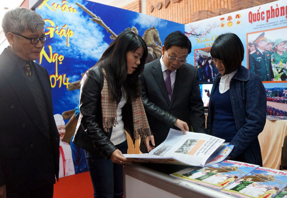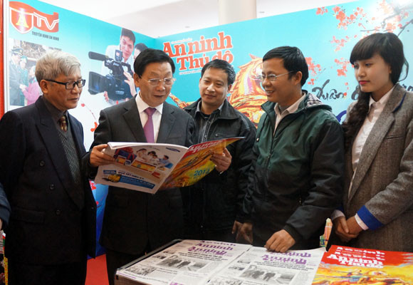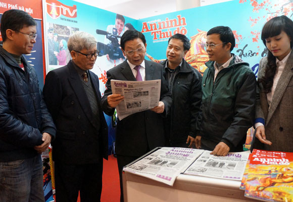 Thăm gian trưng bày Báo An ninh Thủ đô, Chủ tịch UBND TP Hà Nội Nguyễn Thế Thảo đánh giá cao chất lượng mỹ thuật cũng như nội dung ấn phẩm báo tết ANTĐ 2014
