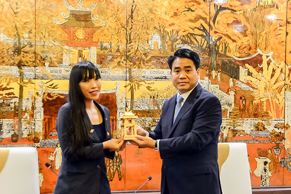 Chủ tịch UBND TP Hà Nội tặng bà Stephanie Đỗ - Chủ tịch Nhóm nghị sĩ hữu nghị Pháp-Việt của Quốc hội Pháp biểu tượng Khuê Văn Các