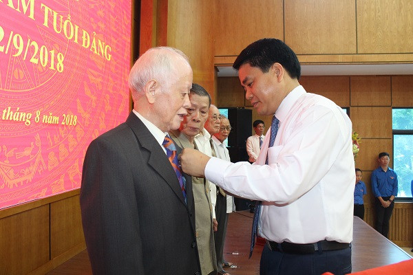 Chủ tịch UBND TP Nguyễn Đức Chung gắn Huy hiệu Đảng cho các đảng viên lão thành
