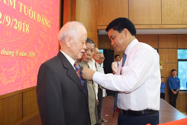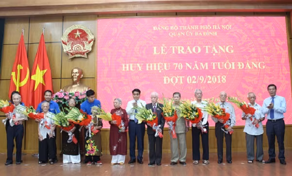 Trước đó, Quận ủy Ba Đình đã đến nhà riêng trao tặng Huy hiệu 70 năm tuổi Đảng cho 26 đồng chí đảng viên do tuổi cao sức yếu. Tại buổi lễ, Chủ tịch UBND TP Hà Nội Nguyễn Đức Chung hay mặt Ban Thường vụ Thành ủy đã gắn Huy hiệu 70 năm tuổi Đảng cho 26 đồng chí đảng viên của quận Ba Đình.