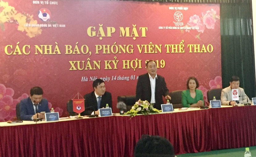 Chủ tịch VFF Lê Khánh Hải (đứng) trong buổi gặp gỡ báo chí chiều 14-1