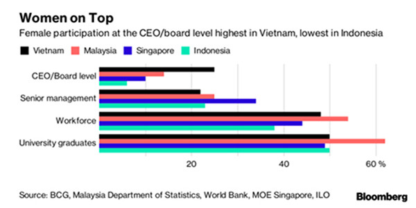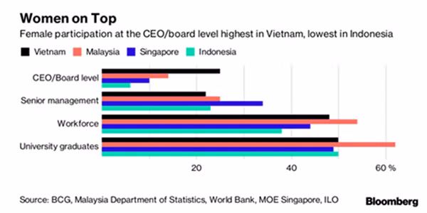 Tại Việt Nam, phụ nữ hiện đóng vai trò khá lớn vào sự phát triển của nền kinh tế, xã hội,... Trong đó, tỷ lệ nữ trong hội đồng quản trị và làm tổng giám đốc (CEO) tại Việt Nam cao hơn nhiều nước khác tại khu vực Đông Nam Á. Theo một báo cáo công bố vào tháng 12/2017 của tập đoàn tư vấn toàn cầu Boston Consulting Group (trụ sở chính tại Mỹ), tỷ lệ nữ trong hội đồng quản trị tại các doanh nghiệp Việt Nam là 25%, cao hơn tỷ lệ 14% tại Malaysia, 10% tại Singapore và 6% tại Indonesia.