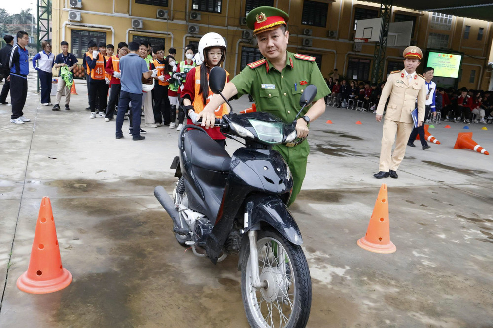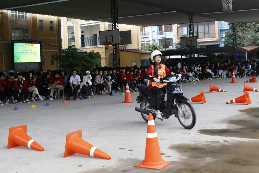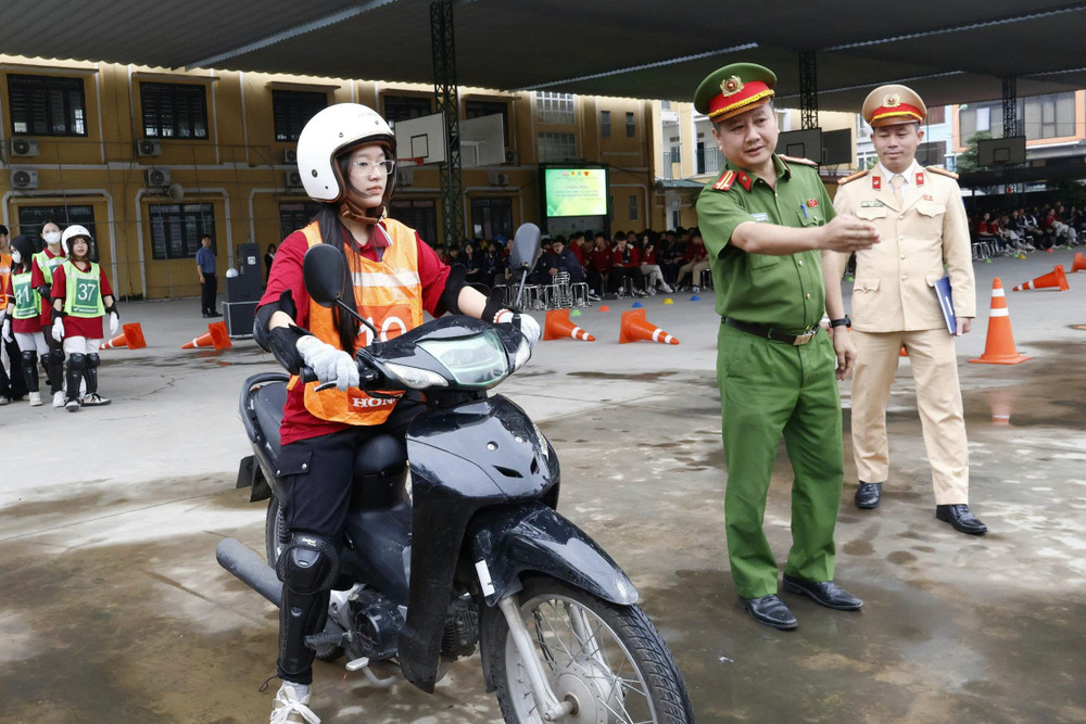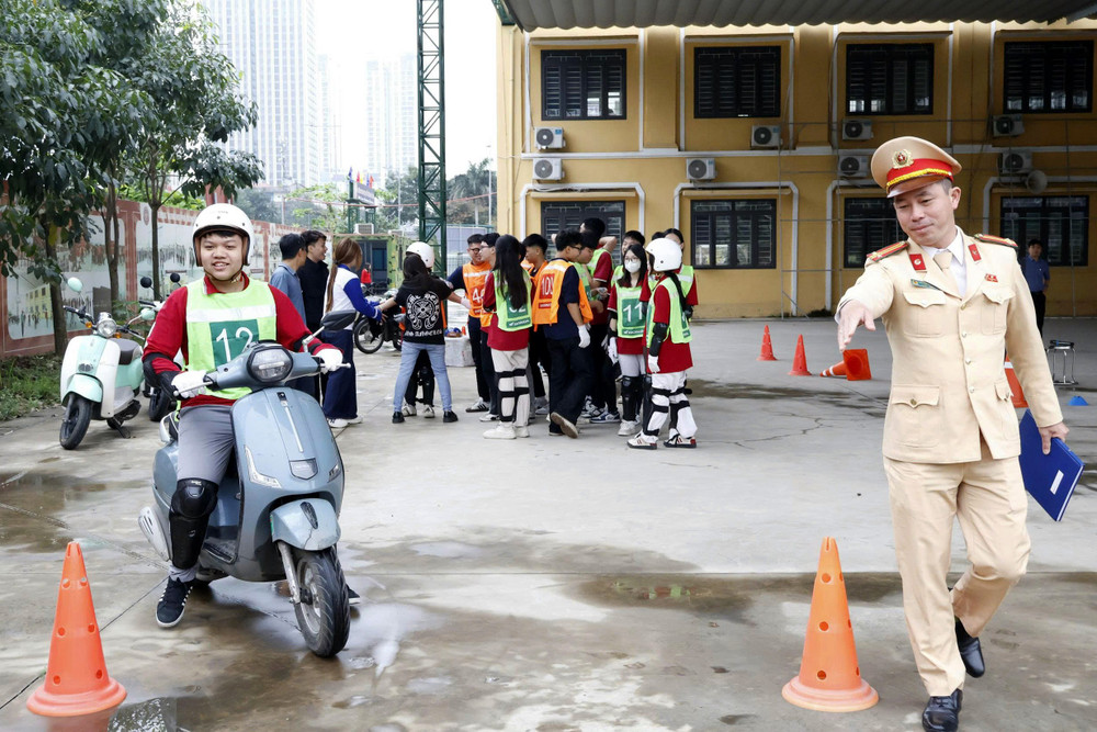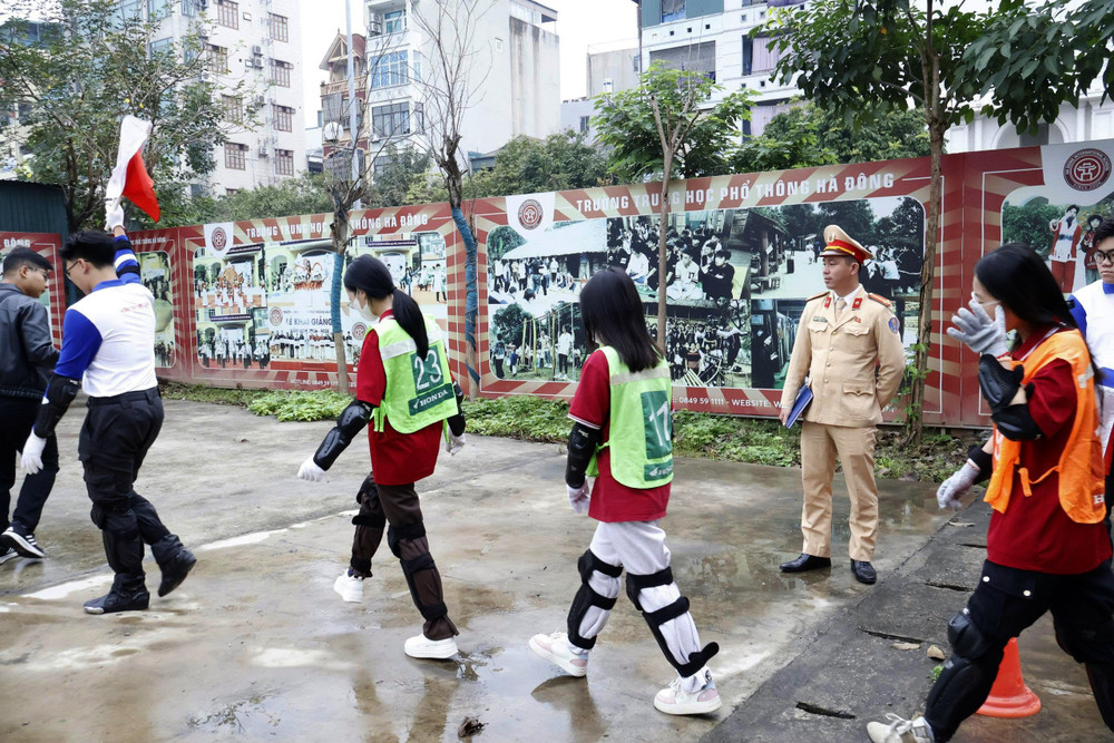 ANTD.VN -Thực hiện kế hoạch tuyên truyền, hướng dẫn kỹ năng lái xe an toàn cho học sinh trung học phổ thông và các cơ sở giáo dục nghề nghiệp trên địa bàn thành phố, Đội Cảnh sát giao thông số 7 (Phòng CSGT - CATP Hà Nội) phối hợp với Công an phường Hà Đông tổ chức chương trình tuyên truyền, hướng dẫn kỹ năng lái xe trực tiếp trên sa hình cho gần 500 học sinh Trường THPT Hà Đông.