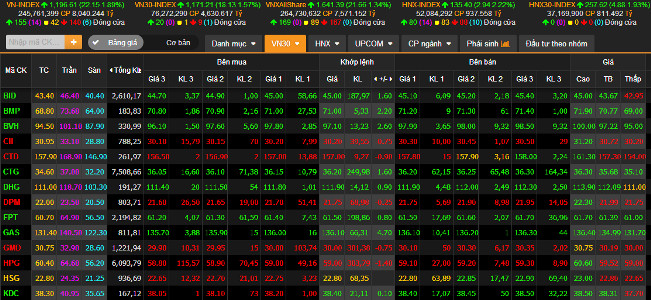 Ngay từ những phút đầu của phiên giao dịch đầu tuần, thị trường đã diễn ra khá sôi động. Dòng tiền lớn lan tỏa khắp thị trường, không chỉ tập trung vào những mã Bluechips như BVH (Tập đoàn Bảo Việt), GAS (Tổng công ty Khí Việt Nam), MSN (MaSan), PLX (Petrolimex), VJC (Vietjet), VIC (Vingroup)... mà các mã thuộc nhóm ngân hàng như ACB (Ngân hàng Á Châu), BID (BIDV), EIB (Eximbank), MBB (Maritime Bank), CTG (Vietinbank), HDB (HDBank), VPB (VPBank)... hay chứng khoán, bất động sản... cũng khá sôi động. ROS (FLC Faros) hôm nay thậm chí còn tăng trần, lên 144.400 đồng/cổ phiếu.