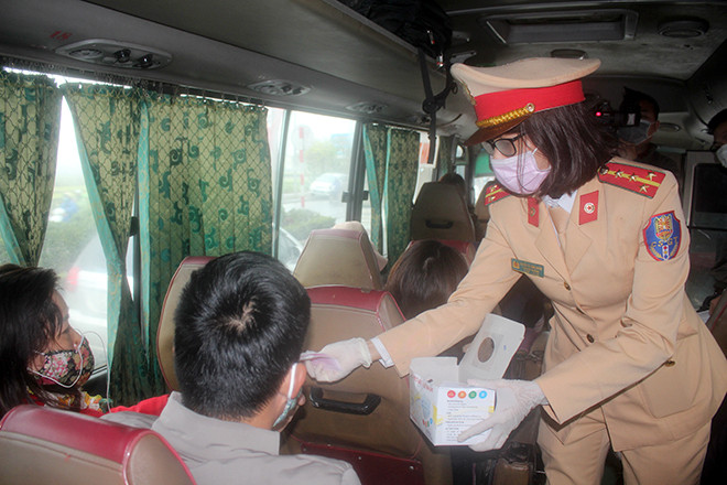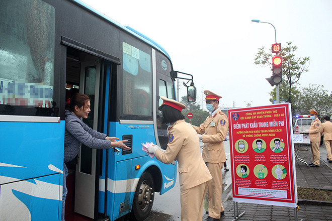 Thậm chí cán bộ, chiến sĩ CSGT - CAH Phúc Thọ còn lên cả xe buýt, xe khách phát khẩu trang miễn phí, đồng thời tuyên truyền chủ động phòng, chống dịch do virus Corona cho hành khách.