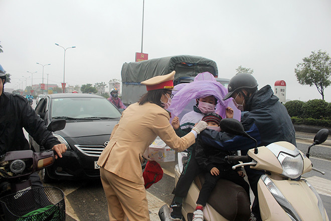 Nhiều người tham gia giao thông được các cán bộ, chiến sĩ Đội CSGT - TT, CAH Phúc Thọ phát khẩu trang miễn phí cảm thấy ấm lòng hơn trong cơn mưa phùn giá lạnh của ngày đầu xuân mới
