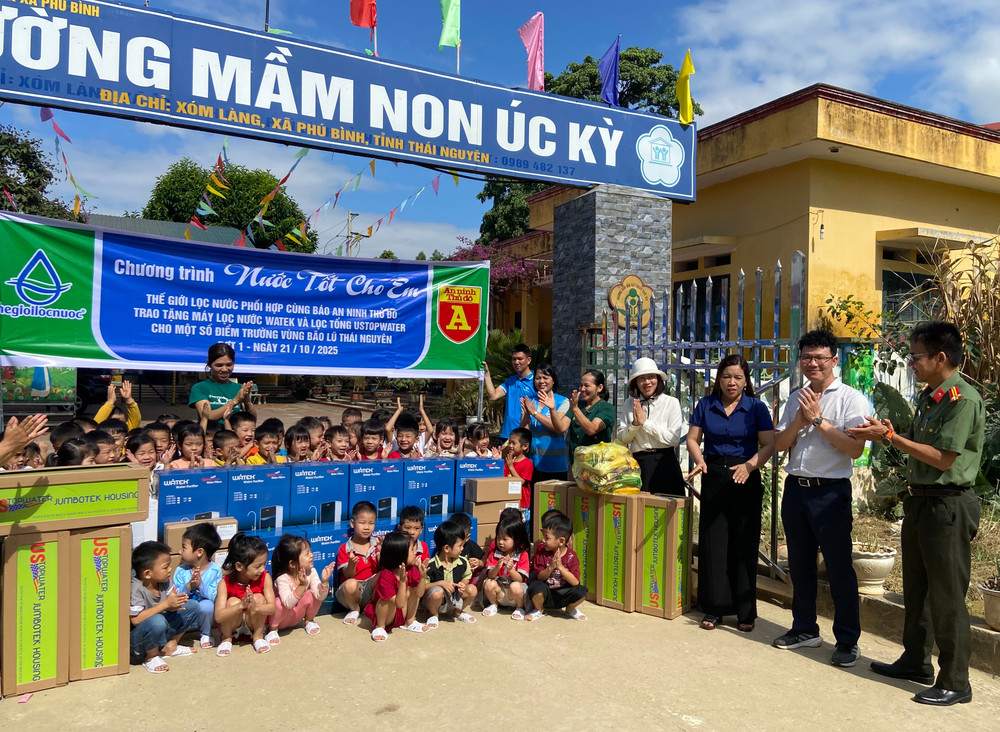ANTD.VN - Ngày 21/10, Báo An ninh Thủ đô phối hợp cùng Công ty TNHH Euromade Việt Nam, thương hiệu Thế giới lọc nước đã trực tiếp lắp đặt và trao tặng máy lọc nước cho 4 điểm trường bị ảnh hưởng nặng nề sau bão số 11 tại tỉnh Thái Nguyên. 11 máy lọc nước và 2 bộ lọc tổng cùng các linh phụ kiện, tổng trị giá khoảng 150 triệu đồng, giúp thầy trò các trường có nguồn nước sạch, an toàn, góp phần ổn định học tập và sinh hoạt sau thiên tai.