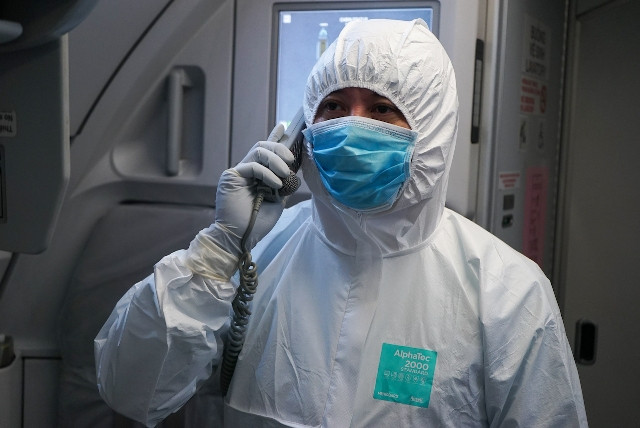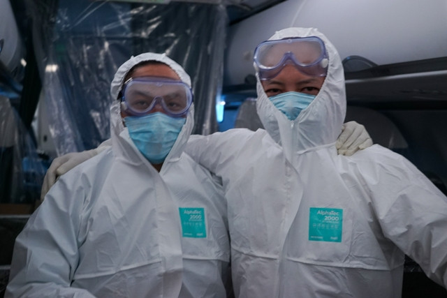 Để tránh lây nhiễm, cả đoàn công tác mặc đồ bảo hộ ngay từ khi bắt đầu lên máy bay. Đồng thời, hành khách cũng được yêu cầu mặc đồ bảo hộ đeo khẩu trang.