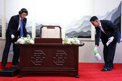 Nhân viên an ninh Triều Tiên phun chất tẩy trùng xung quanh bàn và ghế trước khi nhà lãnh đạo Kim Jong-un ngồi ký văn bản ở Nhà Hòa bình
