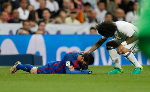 Cú thúc cùi trỏ của Marcelo khiến Messi ngã vật xuống sân