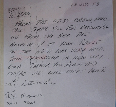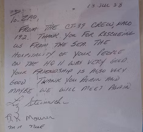 Sau 3 ngày làm “khách”, 3 quân nhân Mỹ được Bộ Tư lệnh Hải quân điều tàu HQ-197 ra đón về đất liền. Cảm kích trước lòng hiếu khách sự giúp đỡ tận tình của những người lính Việt Nam, cô phi công đã viết lại mấy dòng lưu bút và đưa cho 2 quân nhân kia cùng ký vào để cảm ơn những người lính Việt Nam trên tàu HQ-11.